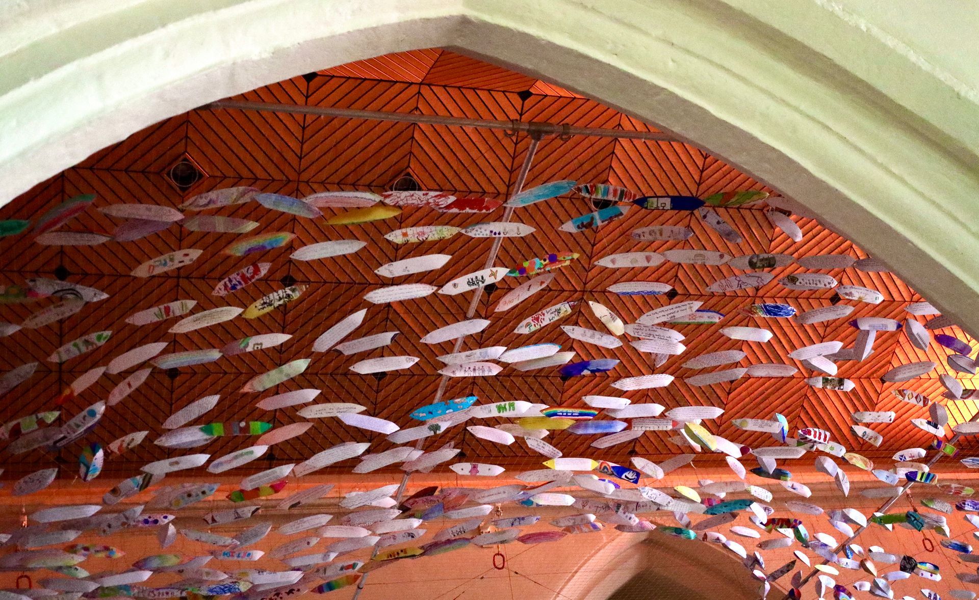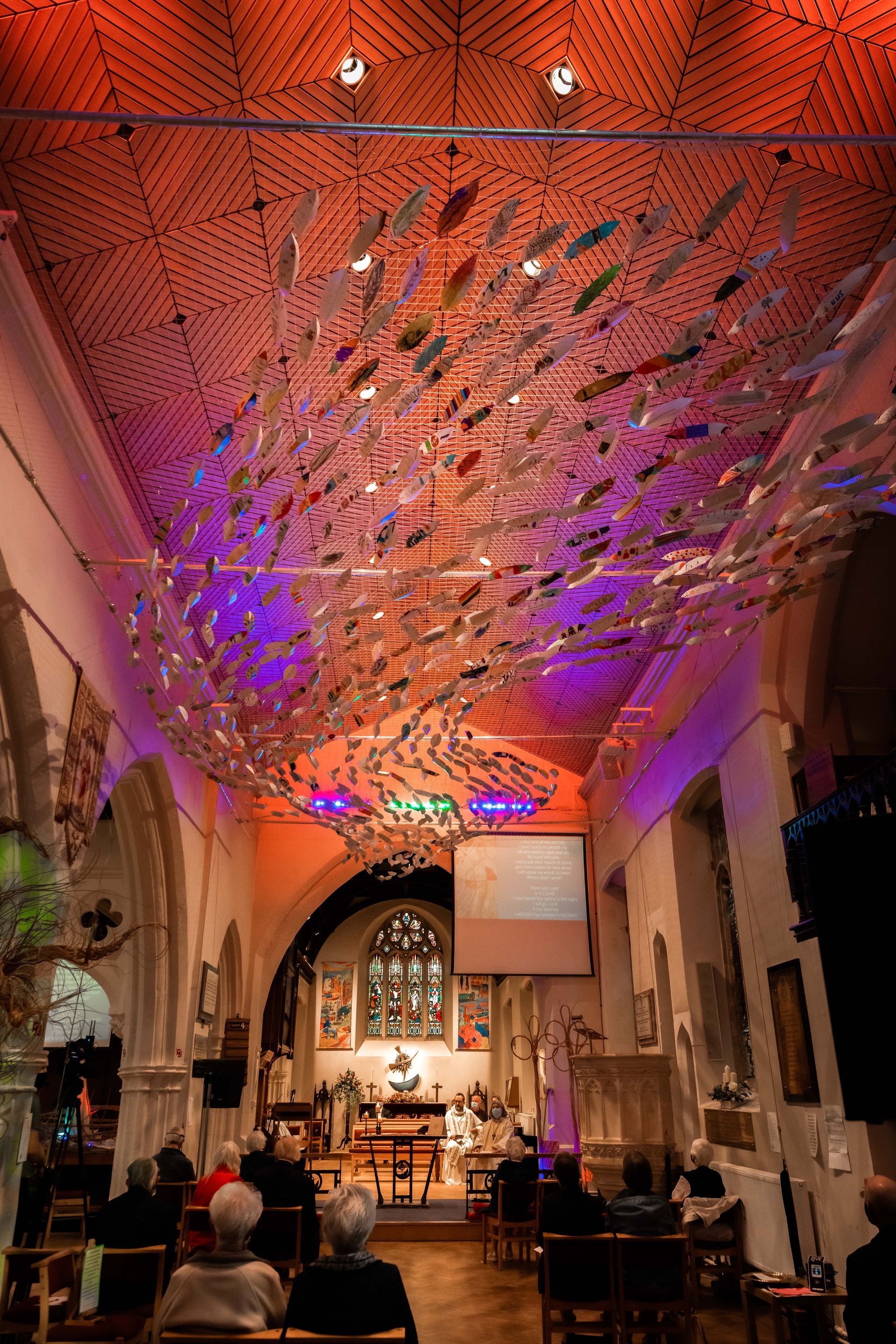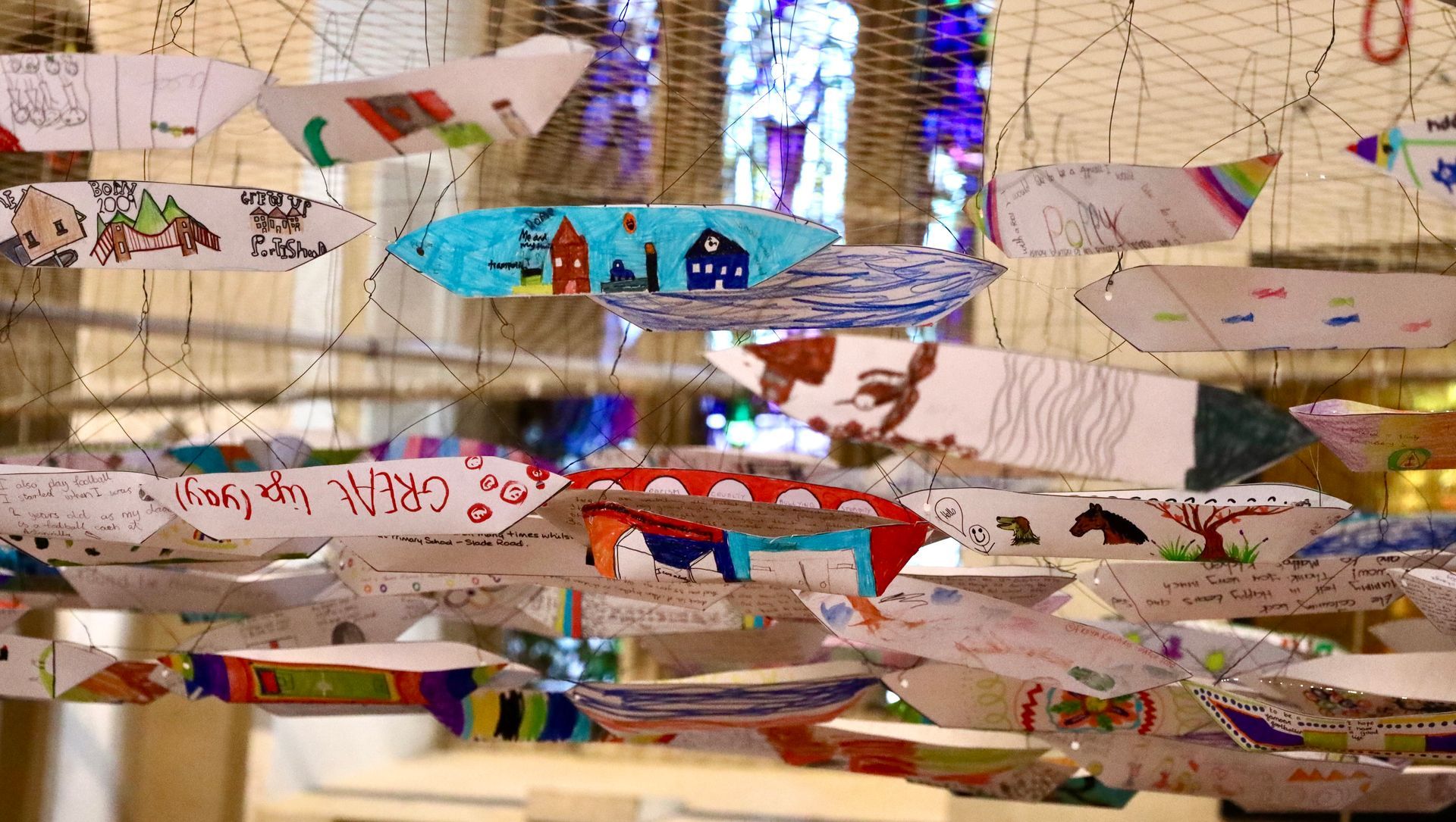 A photo album from Storyboat 700+, featuring a wave shaped sculpture installed in the nave. The flotilla sculpture is made up of over 700 suspended card boats, depicting written stories, memories and colourful designs, created by members of the community.