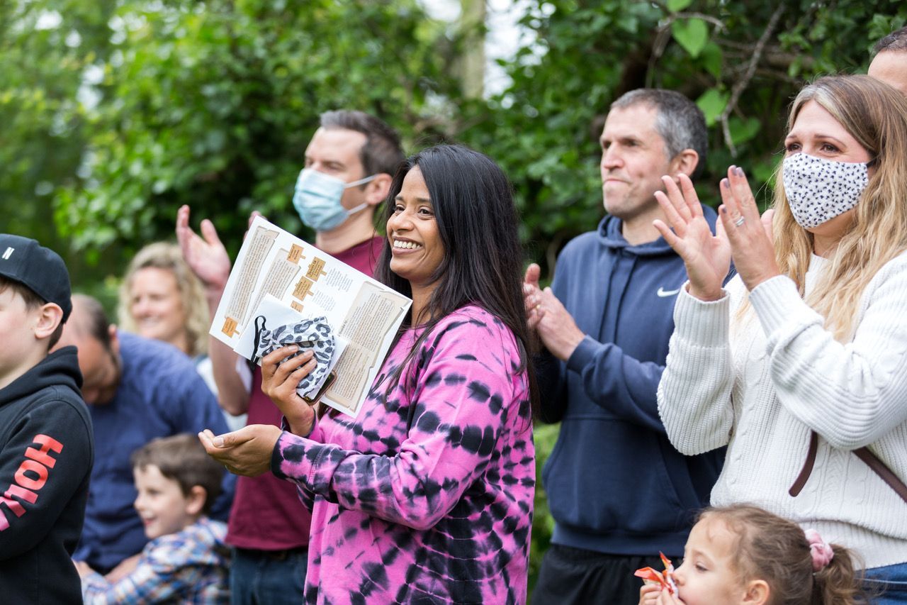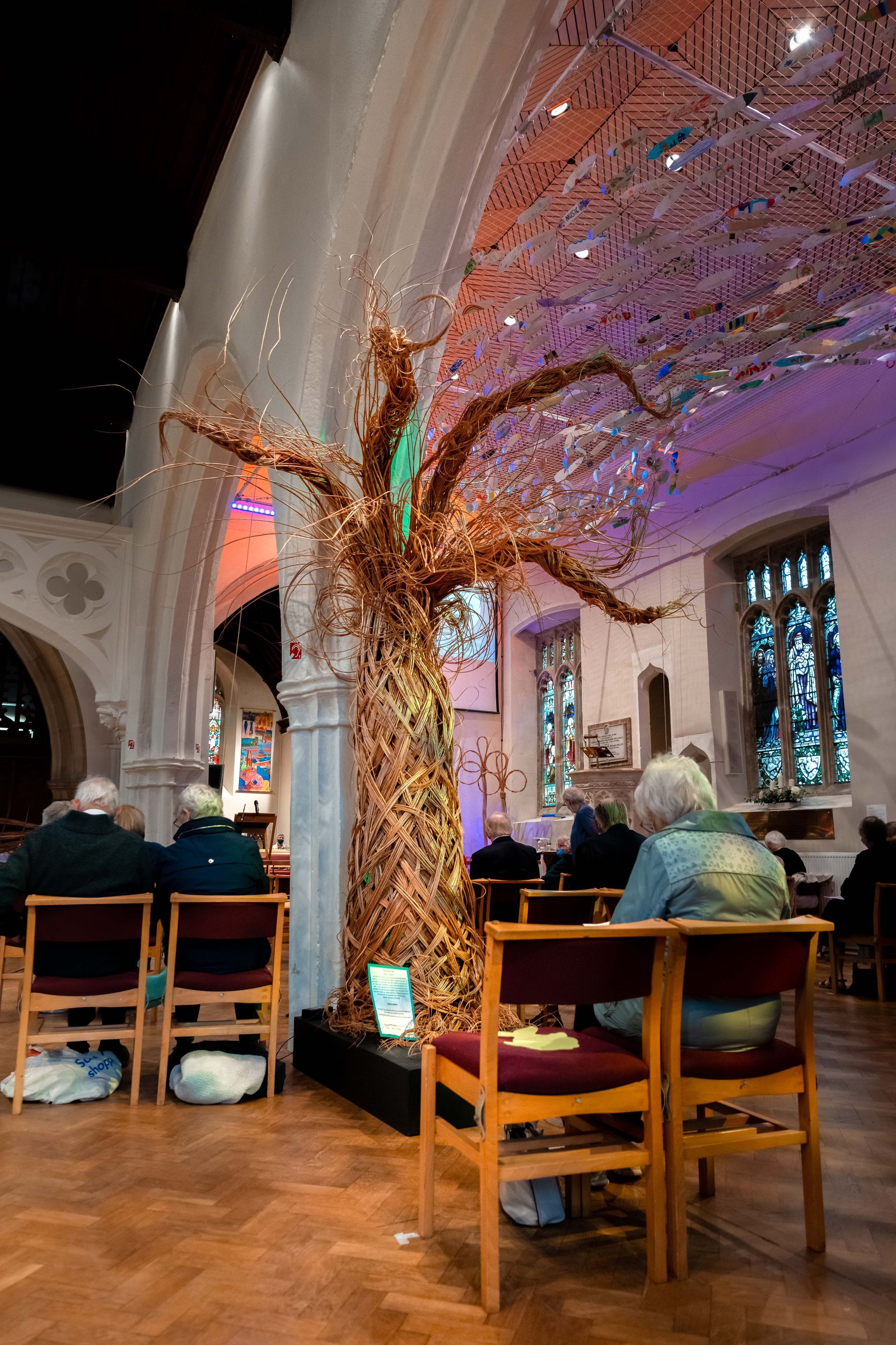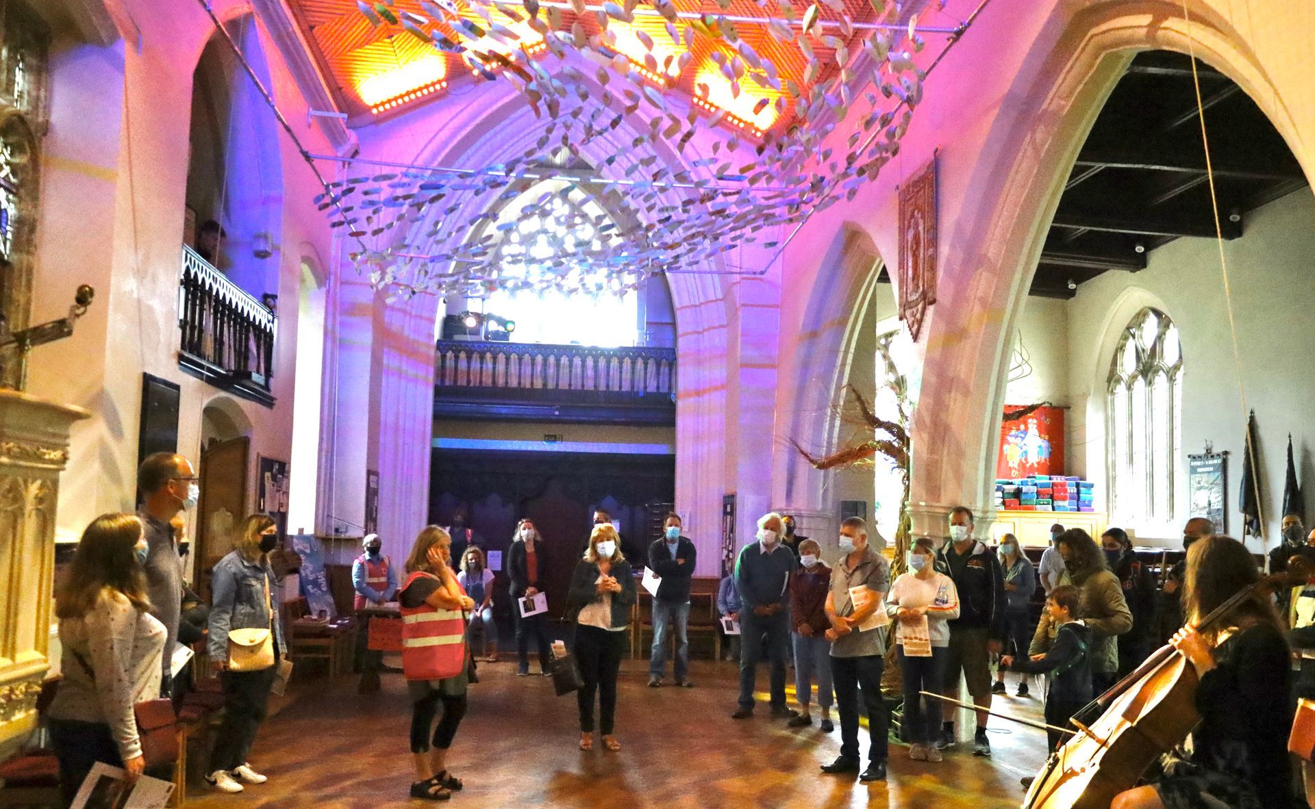 A photo album from Storyboat 700+, featuring a wave shaped sculpture installed in the nave. The flotilla sculpture is made up of over 700 suspended card boats, depicting written stories, memories and colourful designs, created by members of the community.